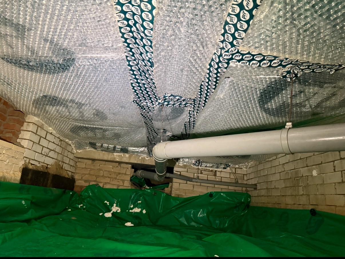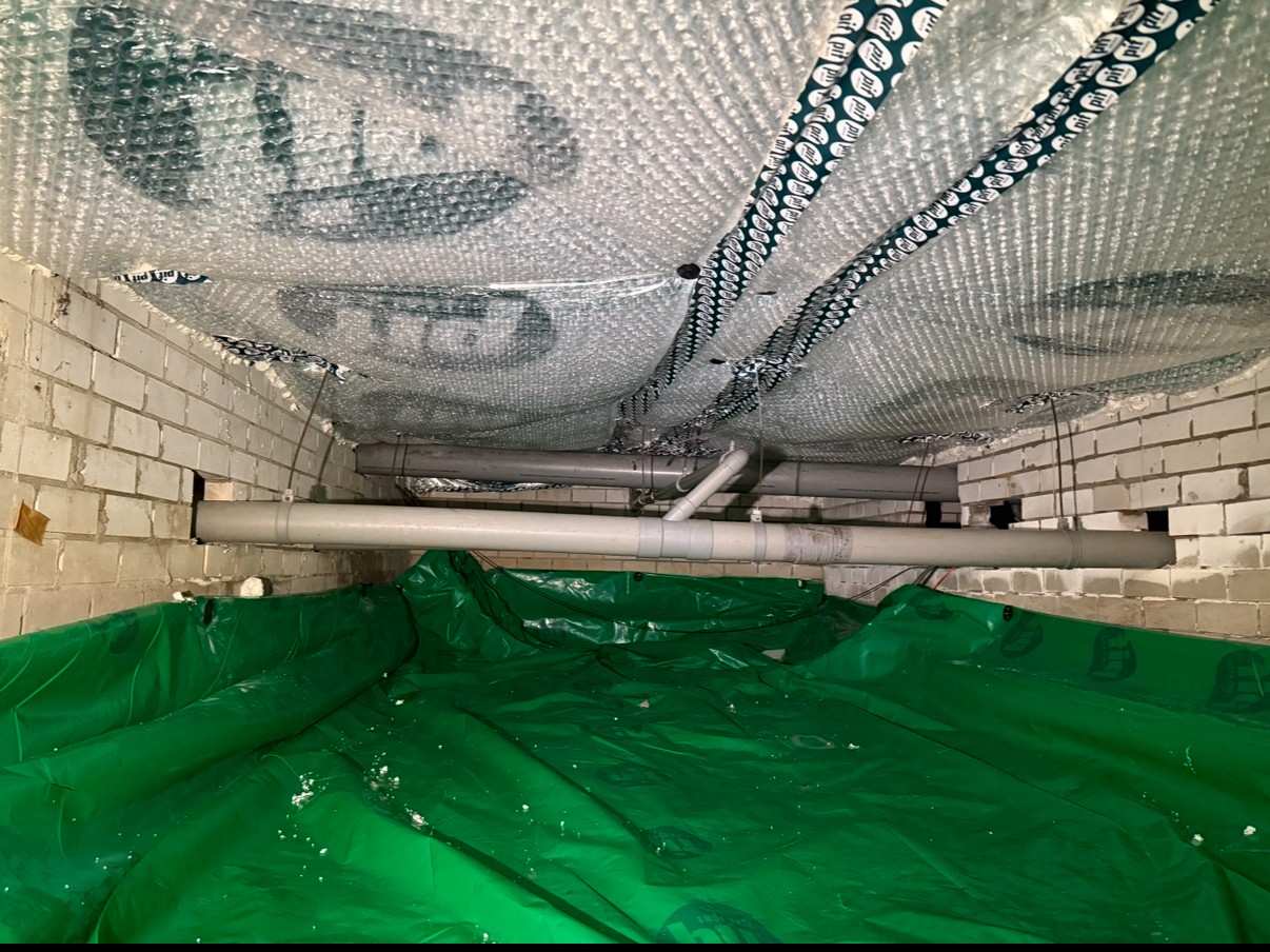 We began by placing the bottom foil. This layer is critical as it helps create a barrier between the insulation and the concrete floor. We took precise measurements, cutting the foil into seven distinct compartments. Once cut, we laid each section down carefully and secured it by attaching it to the walls to ensure that the foil would remain in place and function effectively.